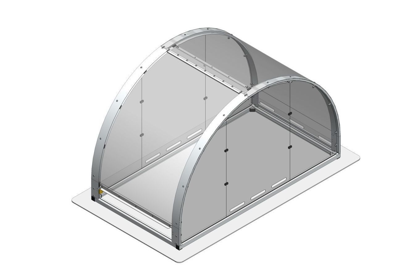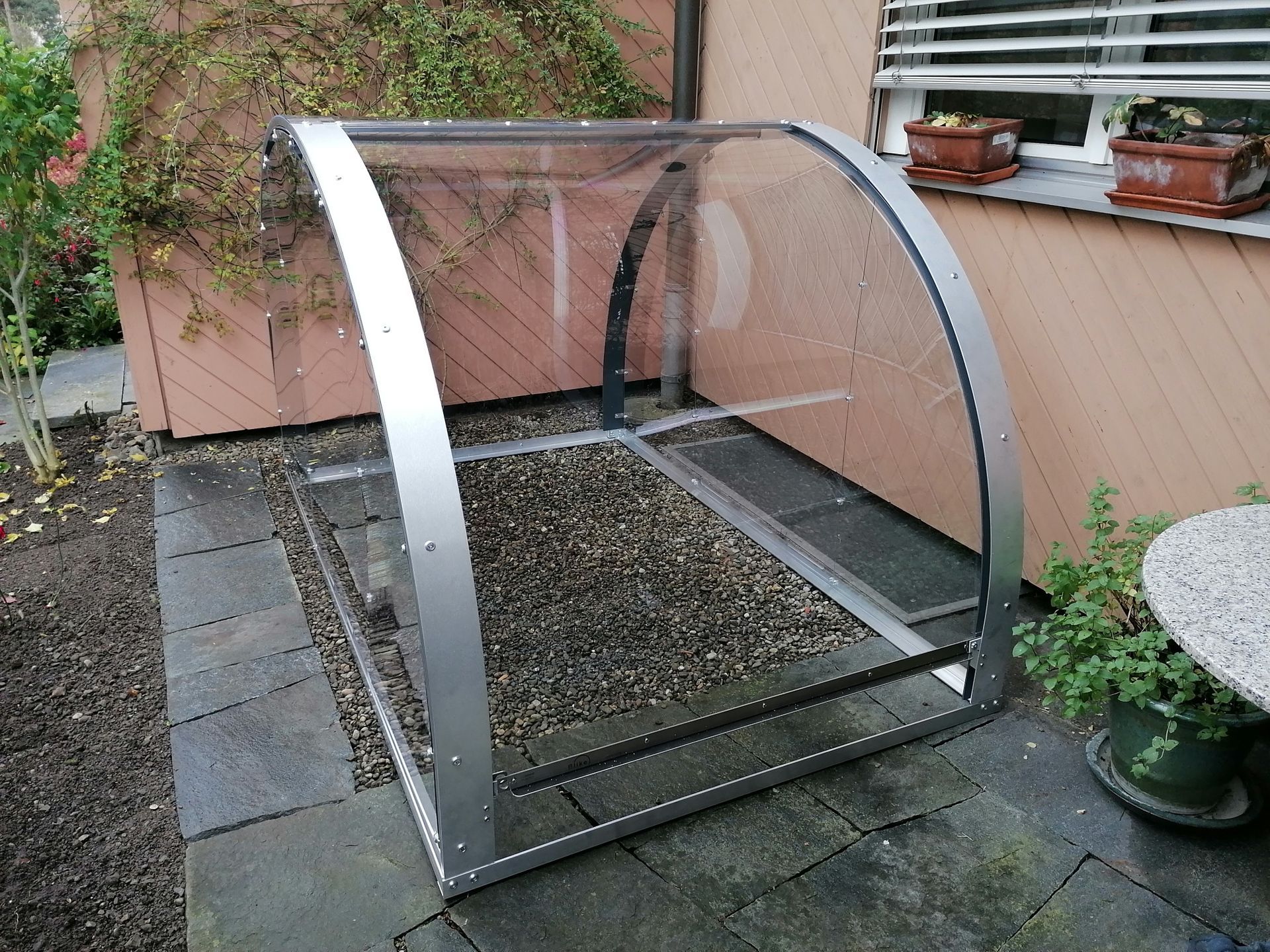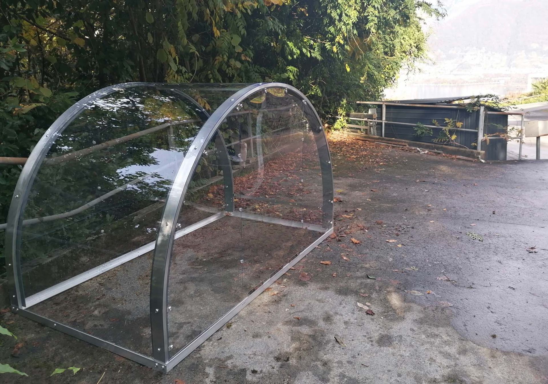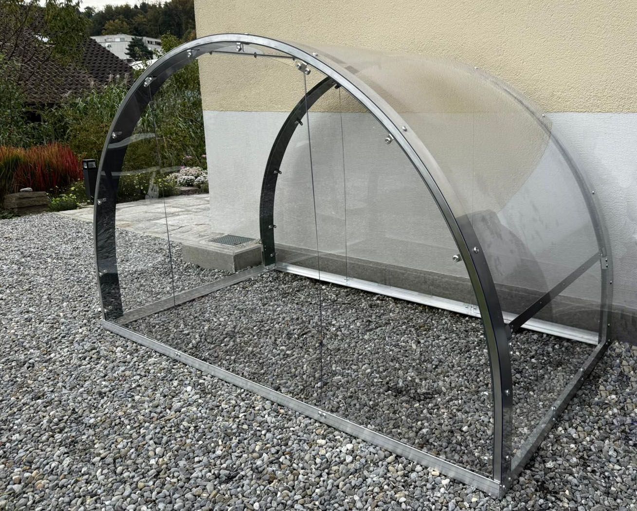 Die Grundkonstruktion und die Bögen sind aus Aluminium und für alle Varianten gleich. Die Eindeckung und die Seitenwände können mit verschiedenen Materialien erfolgen. Wir bauen unser Angebot laufend aus.